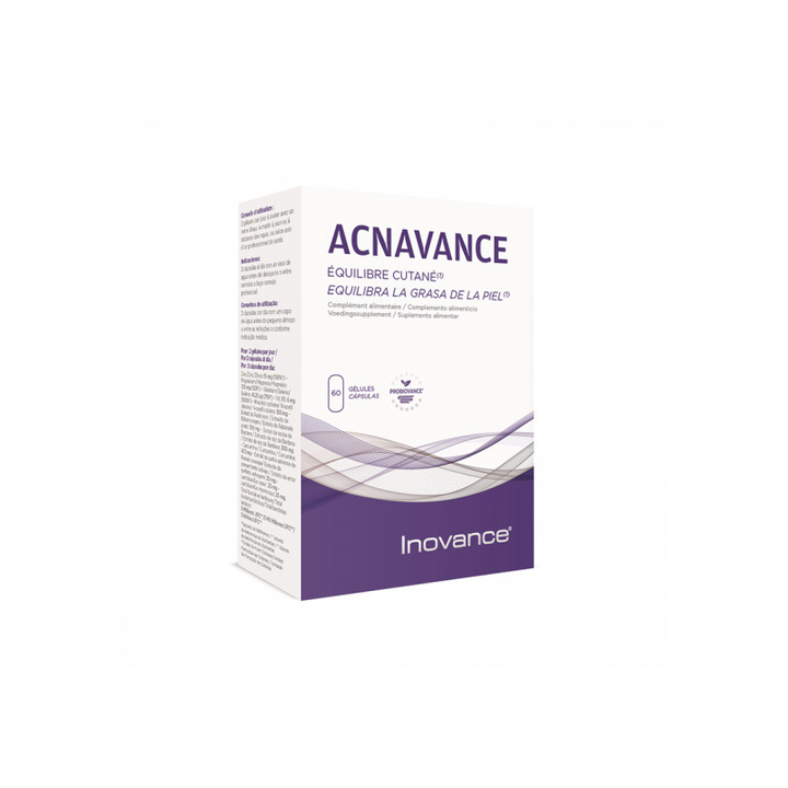 INOVANCE ACNAVANCE es un complemento alimenticio presentado en forma de 60 cápsulas, diseñado específicamente para contribuir a la salud y el equilibrio del sistema cutáneo. Su formulación contiene ingredientes cuidadosamente seleccionados que ayudan a mejorar la apariencia de la piel, reduciendo la inflamación y favoreciendo la regeneración celular.