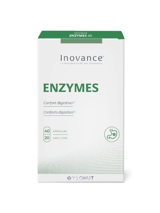 INOVANCE ENZYMES es un complemento alimenticio presentado en forma de 40 cápsulas, formulado para favorecer el bienestar digestivo y la optimización de los procesos metabólicos. Su composición incluye una sinergia de enzimas digestivas que contribuyen a la correcta descomposición de los nutrientes, mejorando así la absorción y disponibilidad de los mismos para el organismo.