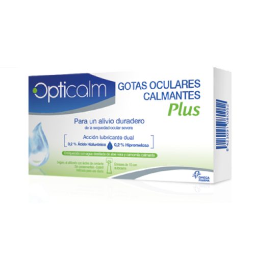 Las Gotas Oculares Calmantes PLUS de Opticalm ofrecen un alivio duradero y proporcionan una sensación relajante y tranquilizante en los ojos. Contienen ácido hialurónico e hipromelosa para una doble acción lubricante y un alivio eficaz, especialmente indicado para la sequedad ocular severa. Además, están enriquecidas con agua destilada de aloe vera y camomila calmante. Este producto es libre de conservantes y adecuado para un uso diario ilimitado, incluso con lentes de contacto. Las cómodas monodosis son reutilizables. Los dos lubricantes, el ácido hialurónico y la hipromelosa, crean un escudo viscoso de protección sobre la superficie ocular, liberando agua de forma progresiva y logrando una hidratación prolongada. Después de esta lubricación, la mezcla única de ingredientes naturales proporciona un efecto relajante y tranquilizante sobre el ojo.