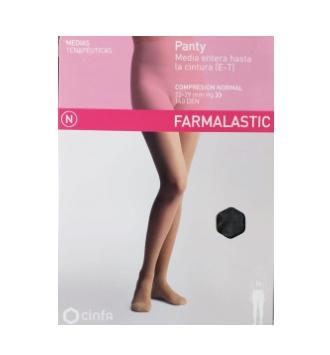 El panty compresivo normal de 140 den de Farmalastic en color negro está diseñado para personas que trabajan o pasan muchas horas de pie, así como aquellas que usan vestimenta corta y prefieren llevar sujeto el abdomen. Este producto está indicado en casos de Insuficiencia Venosa Crónica (IVC), varicosis primaria y secundaria, edema y alteraciones varicosas durante el embarazo. Además, ayuda en las hinchazones edematosas de diversas causas, incluyendo las postraumáticas y/o postoperatorias. También es útil en casos de tromboflebitis y como coadyuvante en la flebotrombosis, así como en el síndrome post-trombótico y tras intervenciones quirúrgicas venosas, siendo eficaz también como complemento en la escleroterapia.
