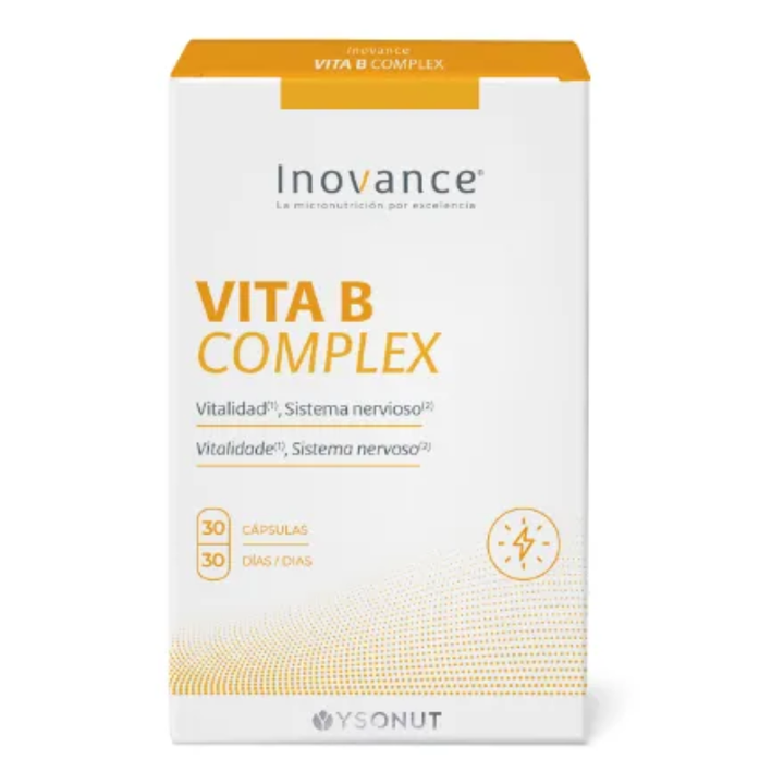 VITA B COMPLEX 30 CAPSULAS INOVANCE YSONUT es un complemento alimenticio diseñado para apoyar la salud general y el bienestar físico. Este producto contiene una combinación de vitaminas del complejo B, que son esenciales para diversas funciones metabólicas y para el mantenimiento de un sistema nervioso saludable.