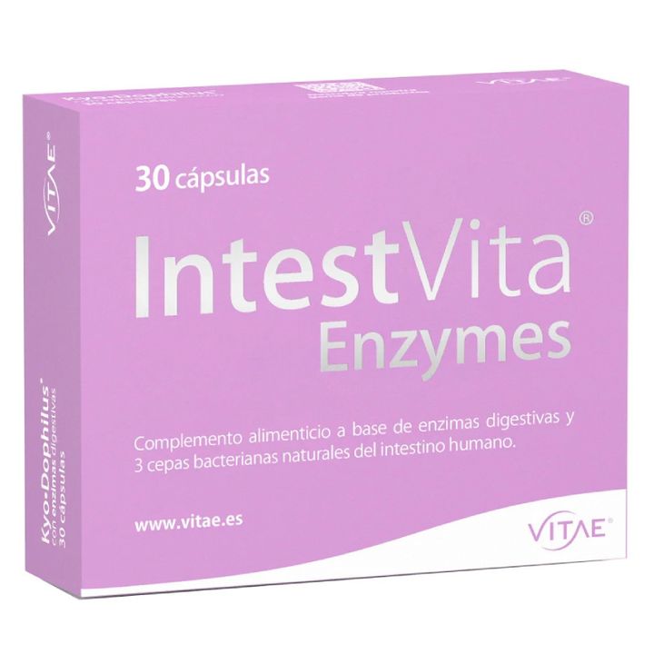 VITAE INTESTVITA ENZYMES es un complemento alimenticio en forma de cápsulas, presentado en un envase que contiene 30 unidades. Su fórmula avanzada combina enzimas digestivas específicas que favorecen la asimilación de nutrientes y mejoran el proceso digestivo, contribuyendo así a una mayor estabilidad intestinal y bienestar general. Características: